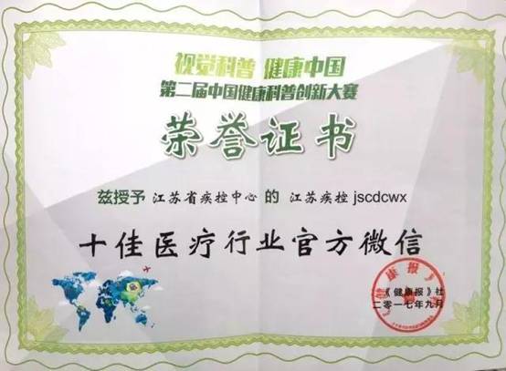 “江苏疾控”微信公众号荣获第二届中國(guó)健康科(kē)普创新(xīn)大赛“十佳医疗卫生行业官方微信”称号